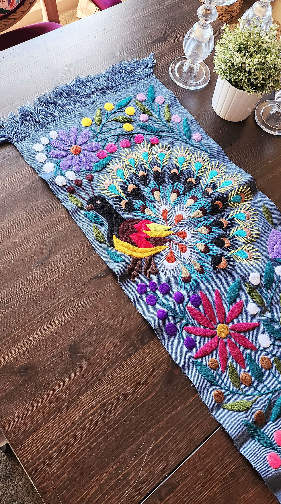 Table Runner with Peacocks hand embroidered and multicolor flowers and birds.